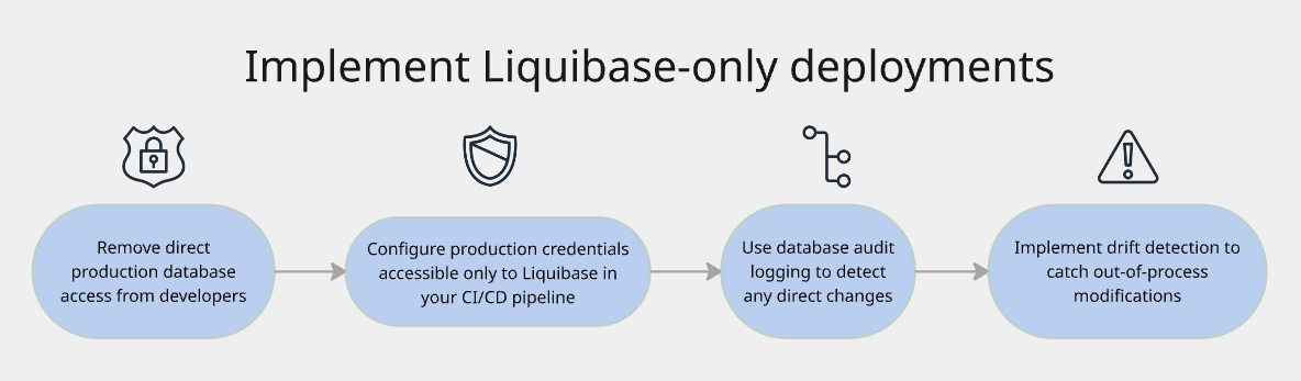 The practice: All production database changes must be implemented through Liquibase Secure, rather than direct database modifications, manual scripts, or GUI tools.